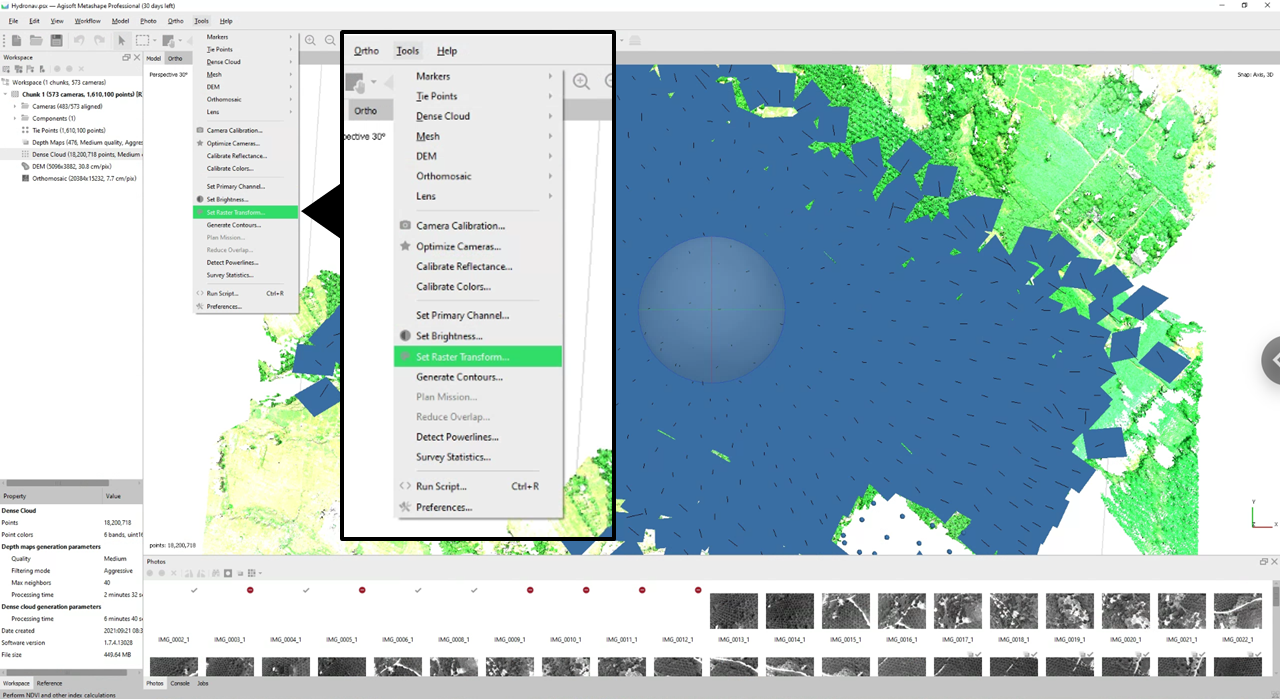 Once you have your 5- or 6-band orthomosaic produced and saved, you can now follow this process. Start by going to Tools > Raster Transformation.