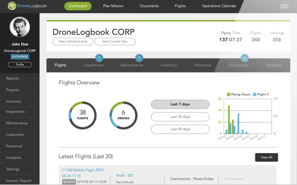 - Details: information about the pilot, the flown location, and the flight duration