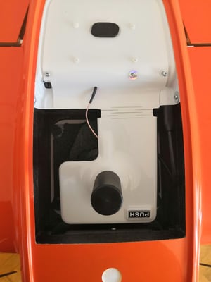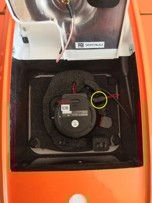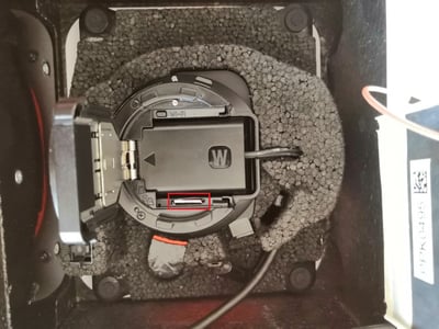 - Open the camera cover by sliding the OPEN lock and gently pulling the lid in the direction of the electronics bay, then unplug the USB payload connector (yellow circle)