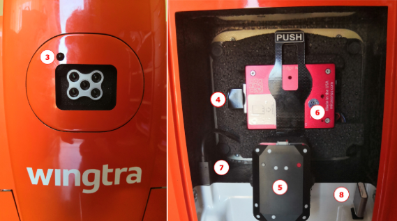 - WingtraOne SD card slot; The WingtraOne SD card needs to be inserted into the slot during the flight as the PPK data is stored there. It is also used for updating the firmware and downloading the flight logs. You can find more information about the WingtraOne SD card in the article WingtraOne SD cards.