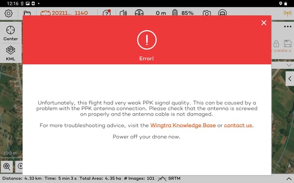 In case you encounter this error, the recommended first action would be to investigate the state of the PPK module, with particular focus on how tightly the PPK antenna is screwed in and the condition of the antenna cable. In this knowledge base article, we go through the steps of the hardware investigation.
