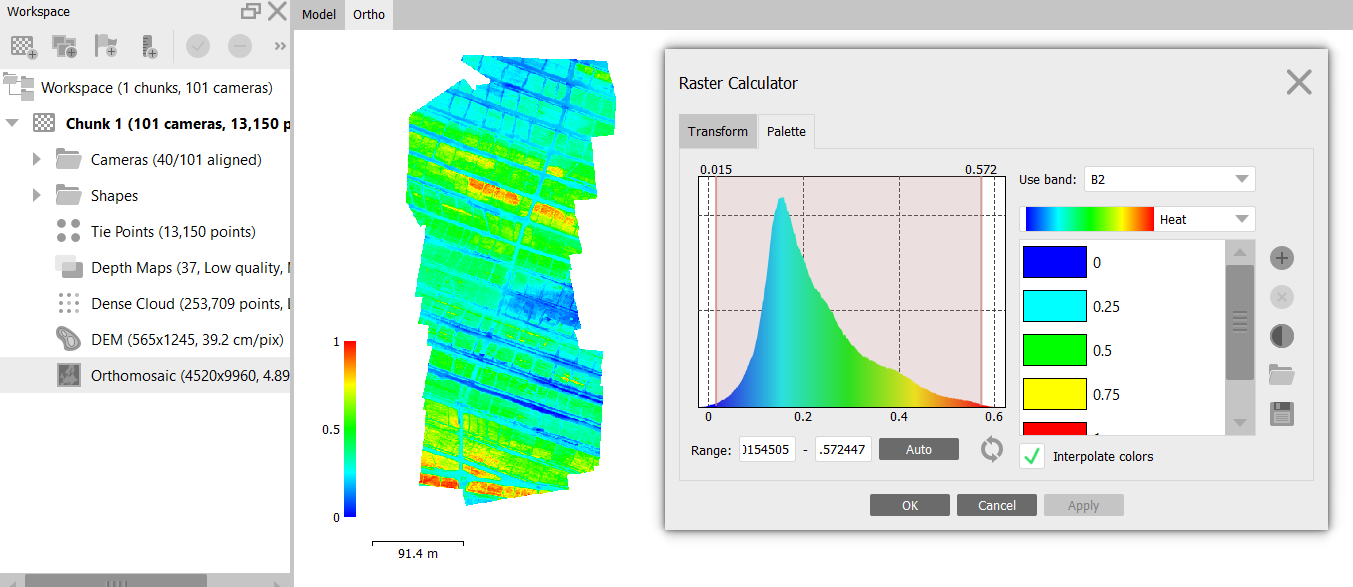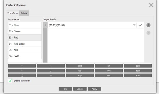 You can write whichever formula you are interested in and go to the Palette tab to chose the combination of colors you want. After choosing the band and colors, select the Range (or click on Auto) and then click on Apply. You will see how the map changes colors in the back.