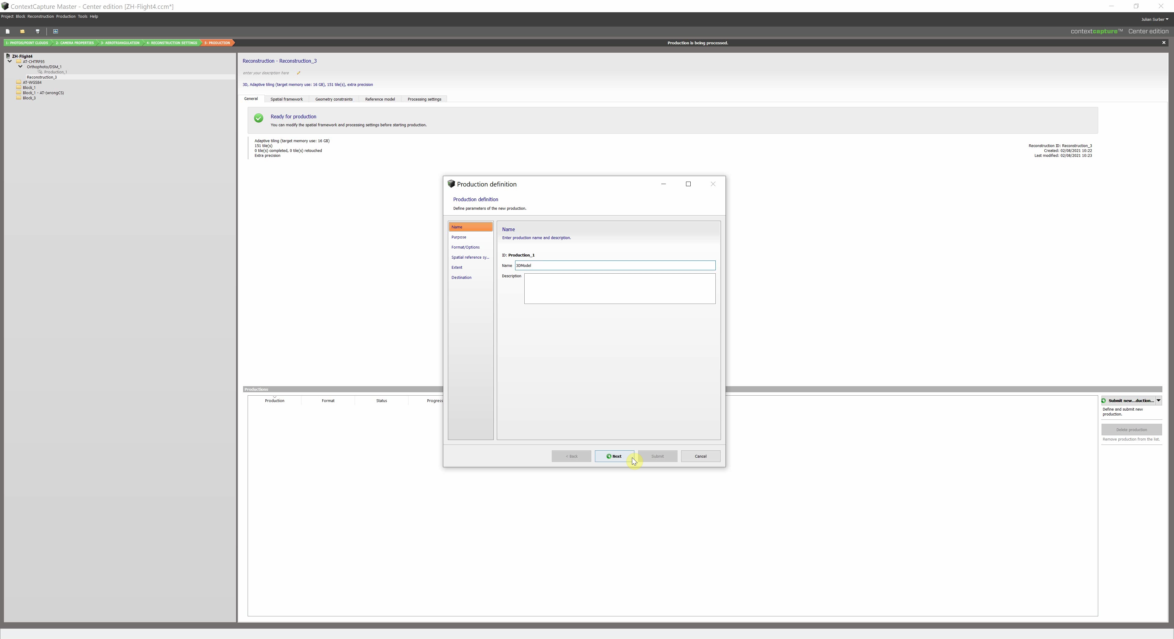 In a fully processed AT block, you can start a new reconstruction on the bottom right to generate your map or 3D model.