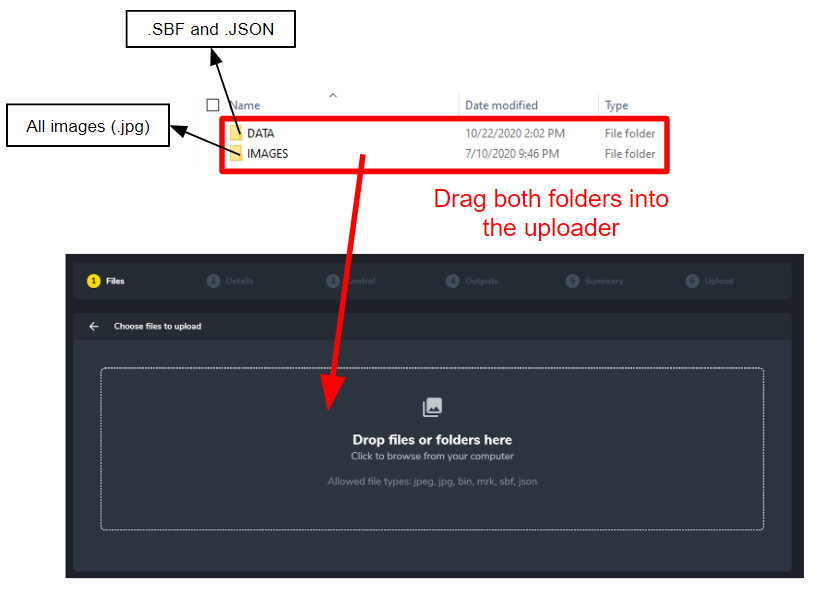 If you have already geotagged in WingtraHub, additional files will be created and placed in the DATA folder. Please do NOT include these additional files when uploading using Propeller PPK. The only two files from the DATA folder that should be uploaded with your images are FlightName WingtraOne.SBF and FlightName.JSON.
