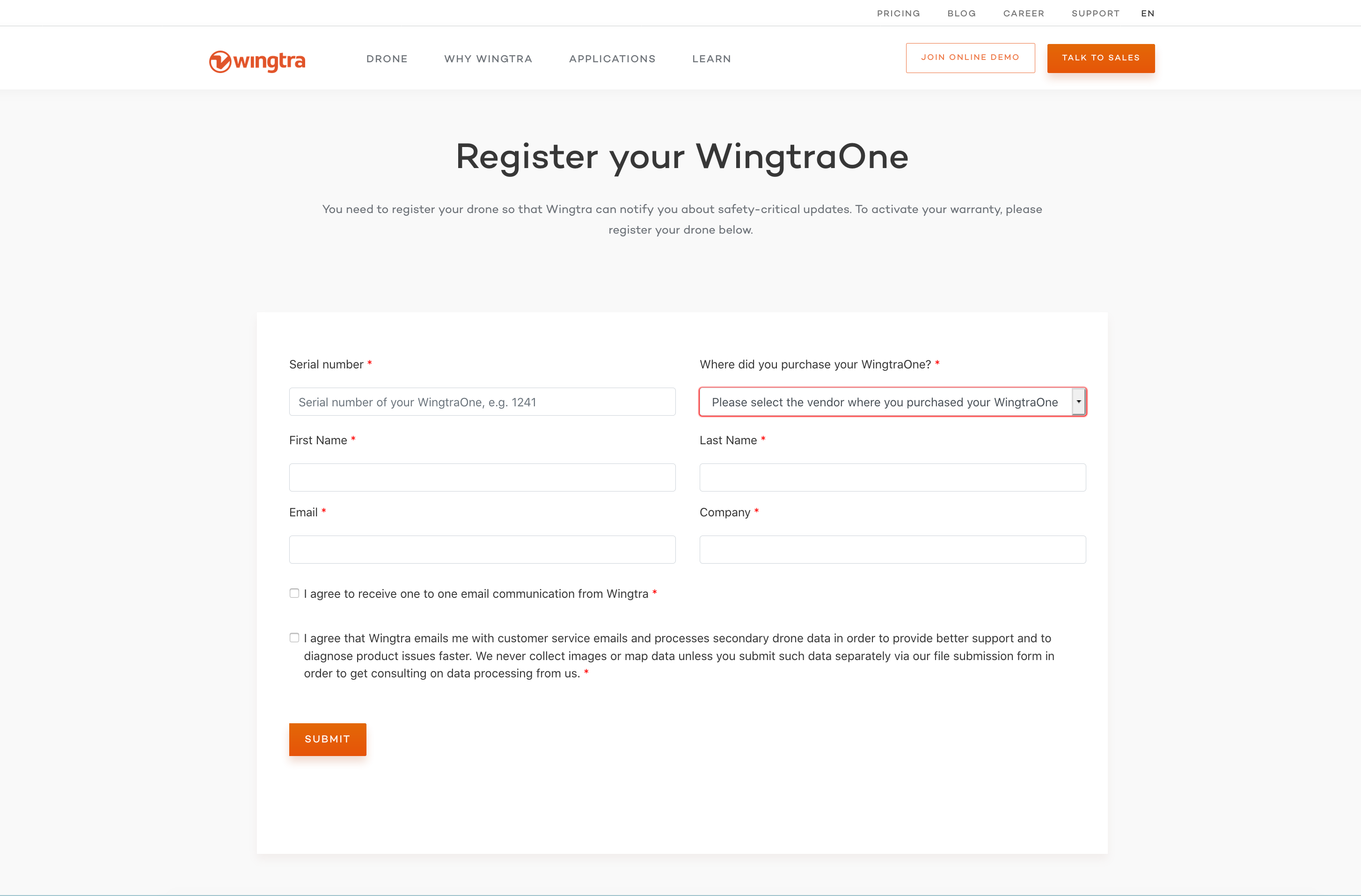 Go to wingtra.com/register to register your drone and to activate your licenses (PPK, Total Maintenance Plan, etc.).