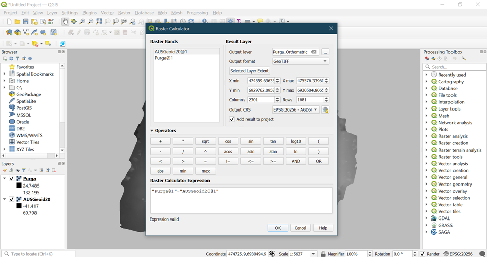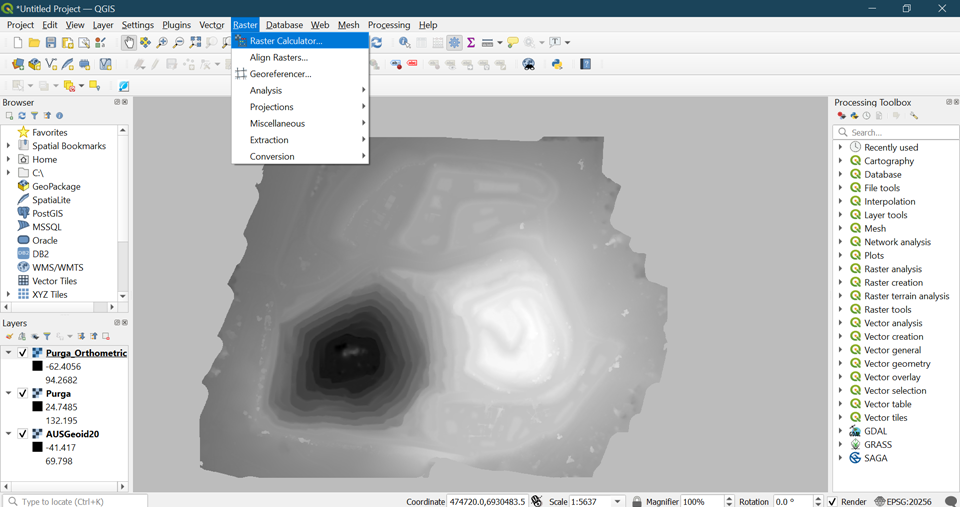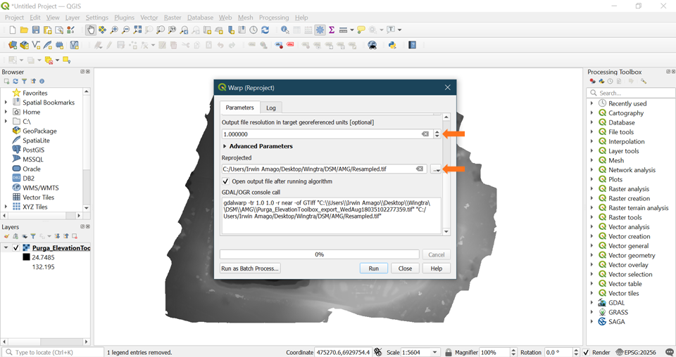 Now that you have a DEM that shows the orthometric height, the next step is to resample so that you meet the WingtraHub parameters. To do this, go to Raster > Projections > Warp (Reproject). The only two values you need to set here are the output file resolution and the file name and location of the resampled output.