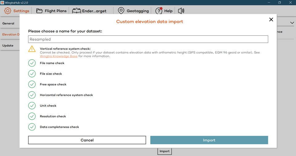 As a final step, to ensure that you processed the DEM correctly, load it into WingtraHub. It should pass all the checks set up by the software. It is also highly recommended that you carry out the elevation check in the next step after importing to verify that the data makes sense.