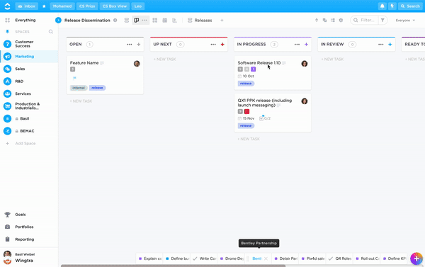After creating a release task, it will have status open (please do not yet work on it). As soon as it is reviewed, revised and approved (typically by Basil) it will get status "up next" (which means you can now work on it). You switch to board view to see progress of the releases.