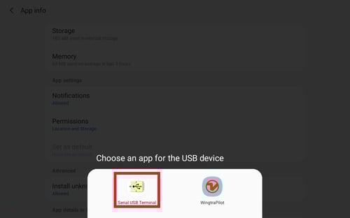 - Choose the app “Serial USB Terminal” to use the USB device (a pop-up prompt appears when connecting the telemetry)
