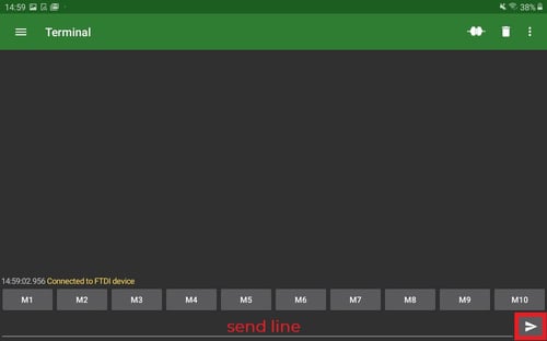 - Click the connect symbol (third from the right): "connected to FTDI device" message should appear in the command line