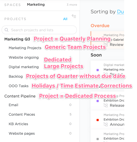 - Projects (Folders): Can be anything where you want to put in lists. For now, these are quarters and dedicated processes like the marketing content pipeline.
