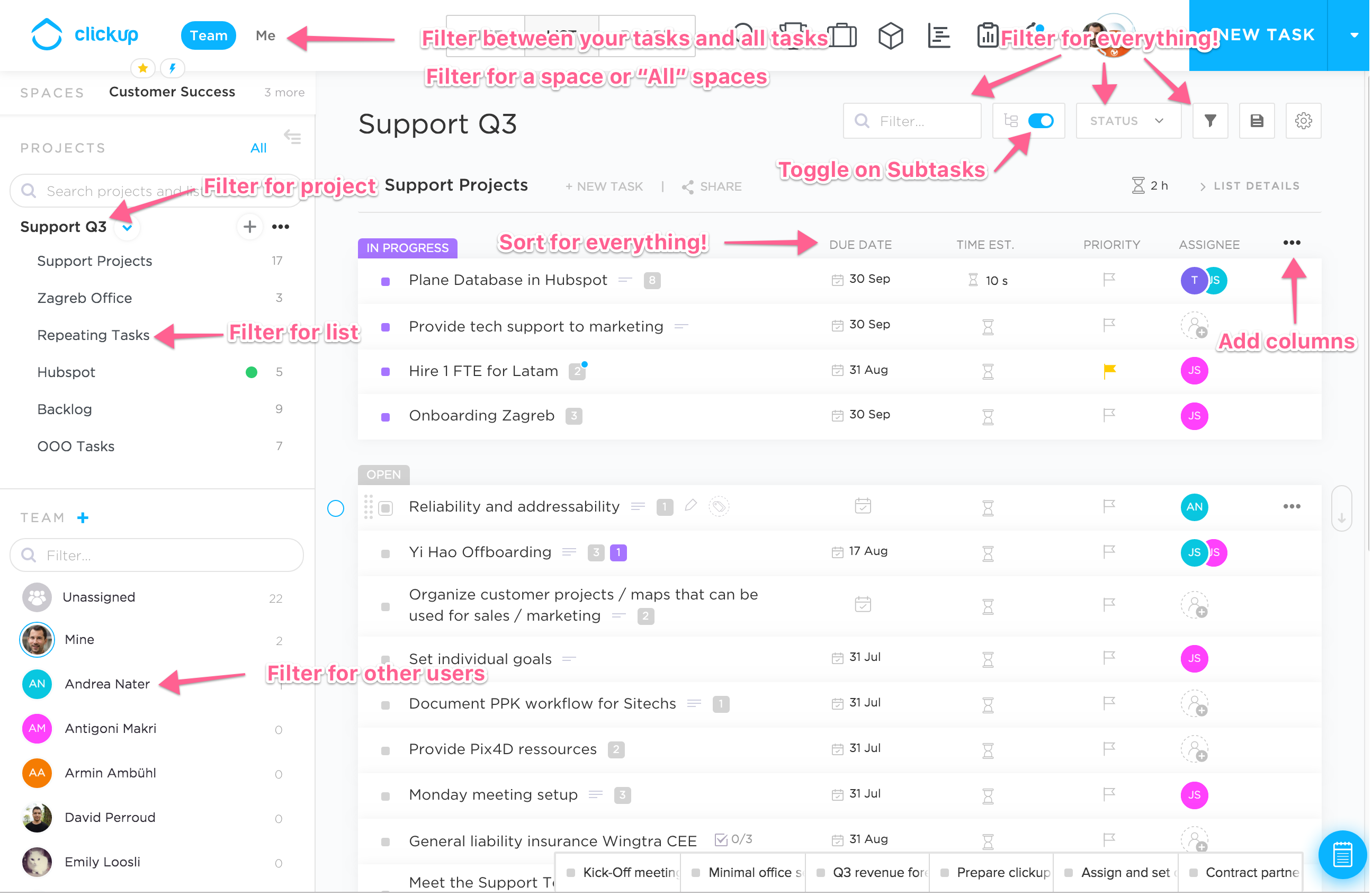 Almost every click onto hierarchy elements / UI elements filters your main view! For example just click on the space name, project name, list name or user name to filter for that. Remember to click onto a higher hierarchy element to again display everything!