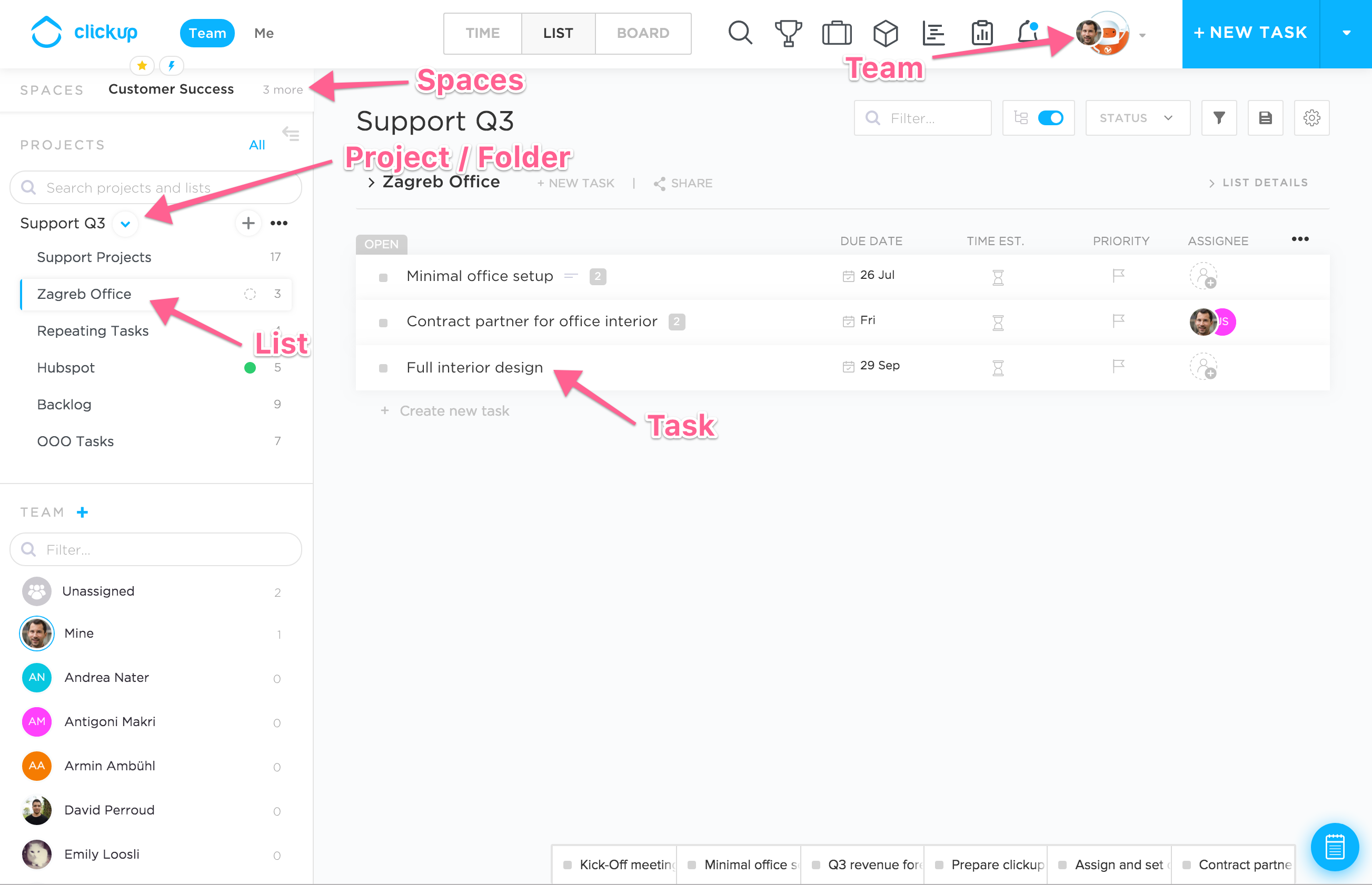 - Lists: Contain and structure tasks like marketing projects, backlog, or container of very large dedicated projects like Intergeo or opening an office.