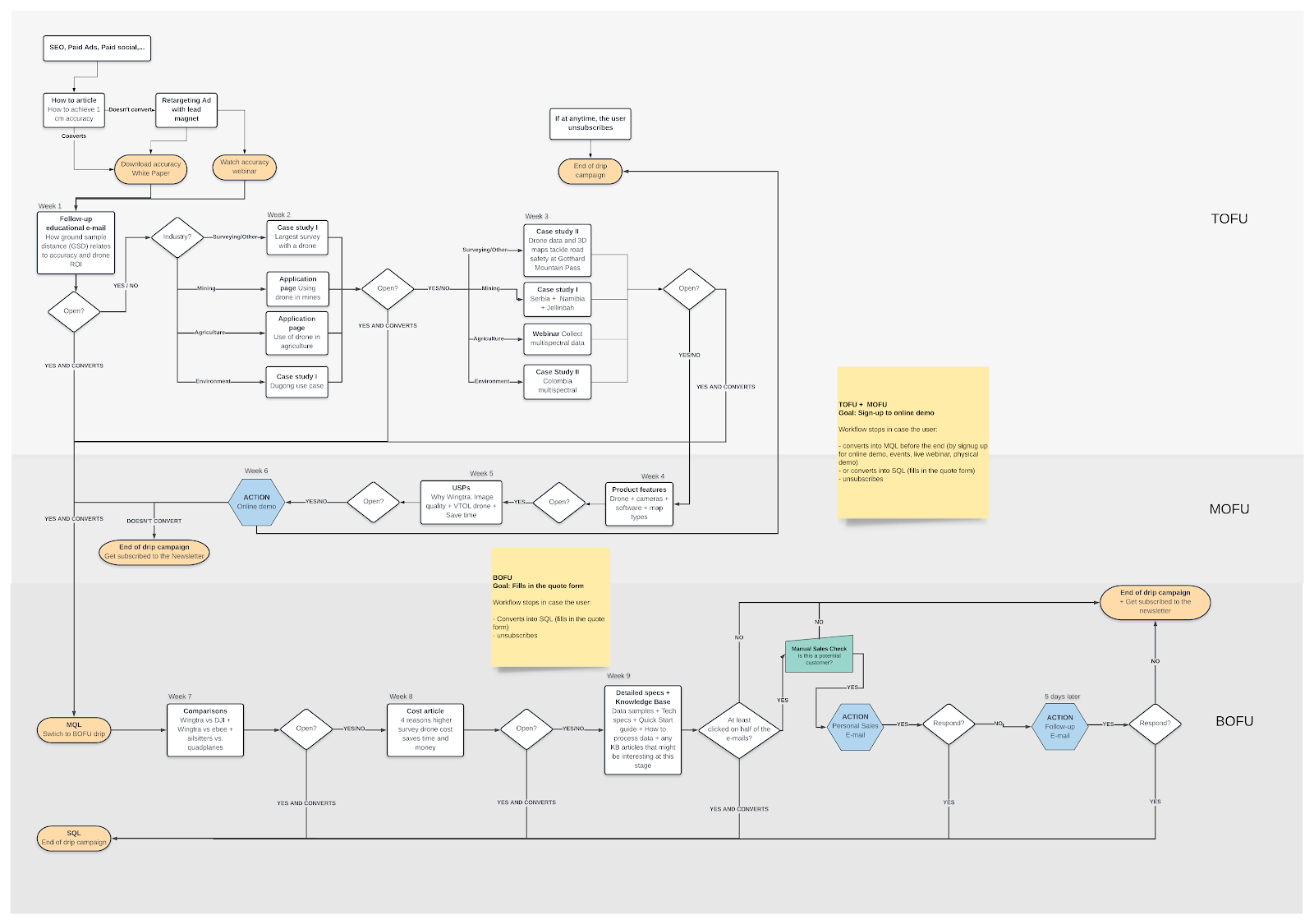 When a visitor gives his email address to access gated content (White Paper, Webinar) he is automatically enrolled in a series of workflow. An email series of educational and promotional content (Use cases, applications, product feature, drone comparisons,...etc) will be sent on a weekly basis.