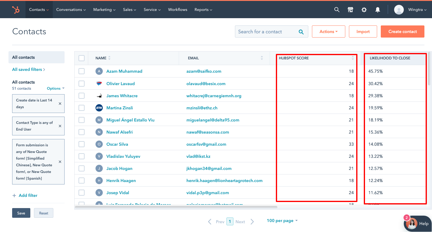 Each lead is assigned a dynamic score that represents its level of engagement with Wingtra. It can help sales reps identify the warmest leads.