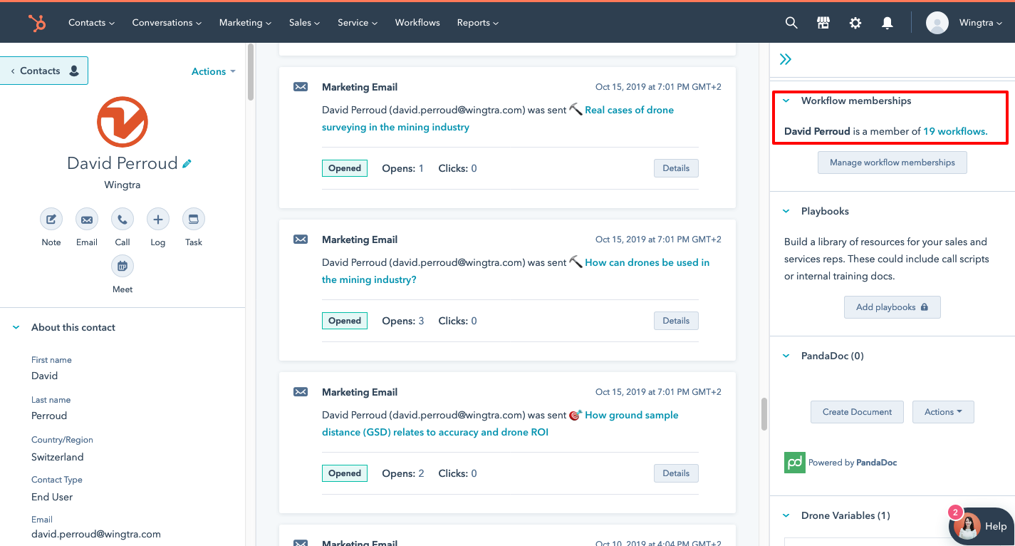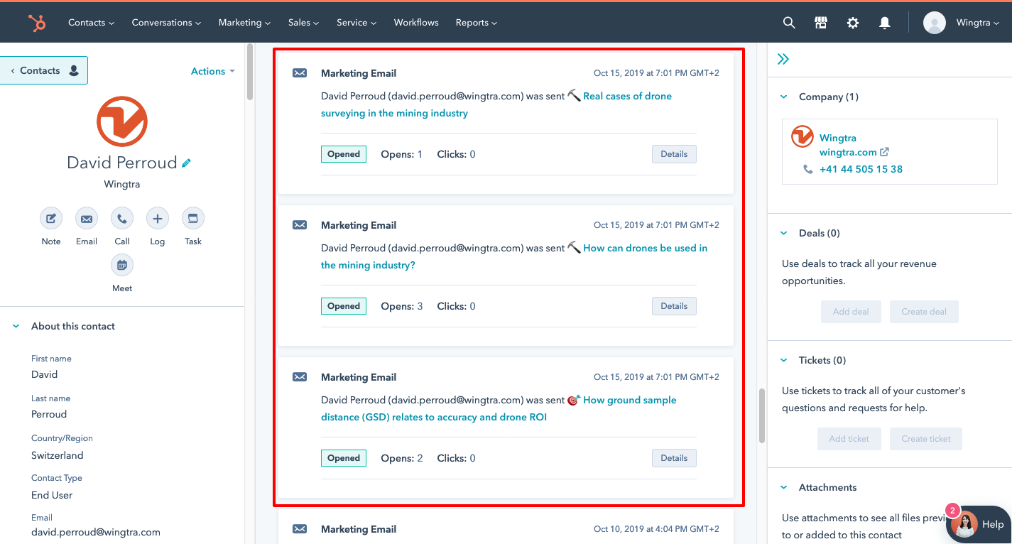 The “Hubspot score” represents the level of engagement of a lead with Wingtra’s marketing and sales efforts based on a Wingtra-made formula. This level of engagement can help you to identify the warmest leads. The formula can be optimized according to sales feedback. Current formula is available here.
