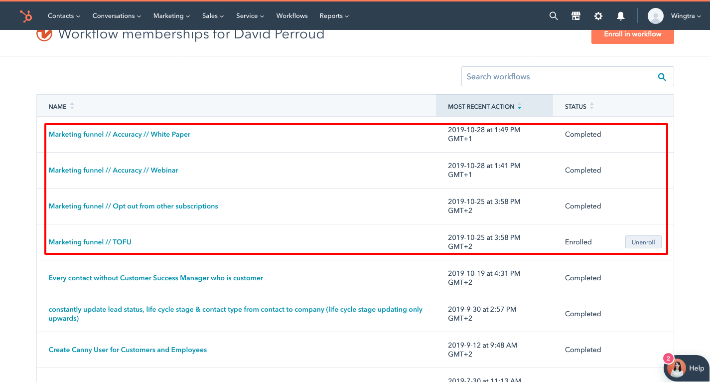 → The drip campaigns are called “Marketing funnel //….”. Here you can see if the contact has been/is still enrolled in one of them. Please consider this when sending them out content from your end.