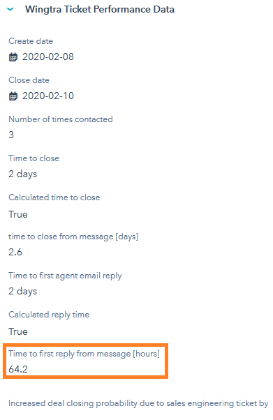 To fix the time to the first reply, you can change the property value in the HubSpot's sidebar "Wingtra Ticket Performance Data". Value can be manually overwritten (script will not alter populated fields). If you need to go back to the calculated value, simply clear the field and wait for 24h.